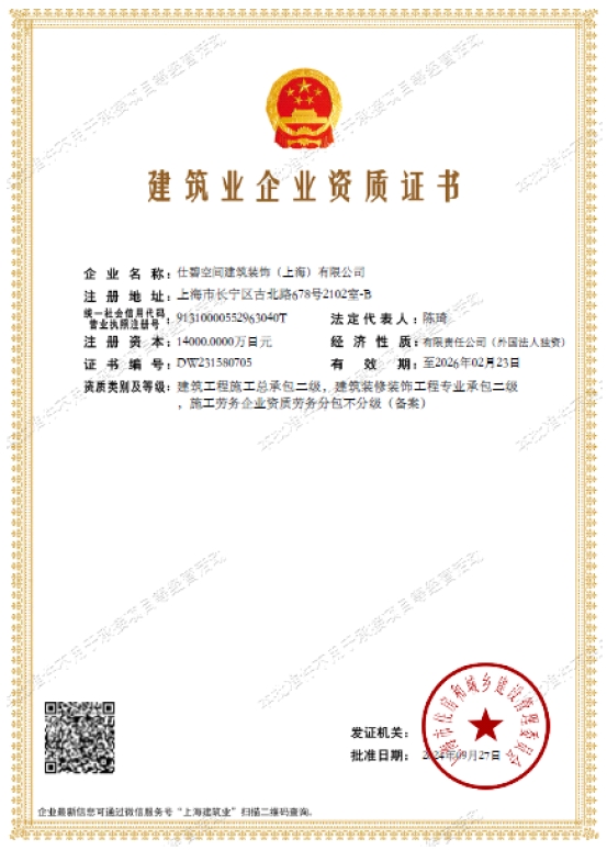 2024年9月27日,仕碧空间建筑装饰(上海)有限公司取得建筑工程施工总承包二级资质。